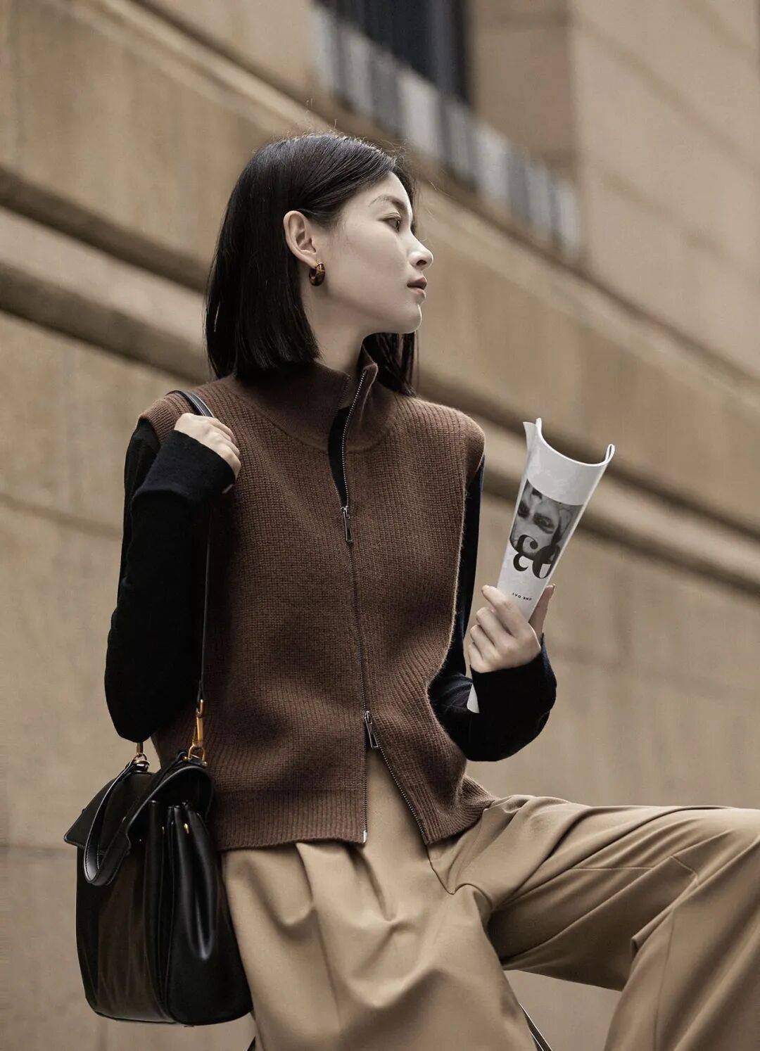 如果不想要春天的造型显得臃肿,又想拥有层次感,这件拉链马甲就是为你准备的“时髦作弊器”。